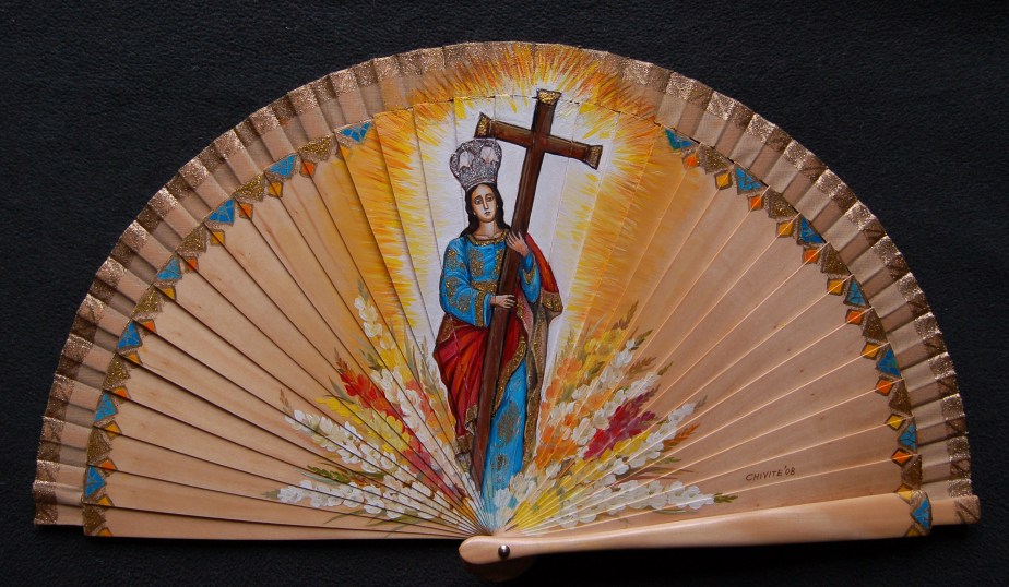Este hermoso abanico, cuidadosamente pintado a mano, captura la esencia y la serenidad de Santa Elena. Esta imagen se venera en el pueblo de Jaén, que lleva su nombre, Santa Elena, y que fue fundada por Carlos III en Sierra Morena.