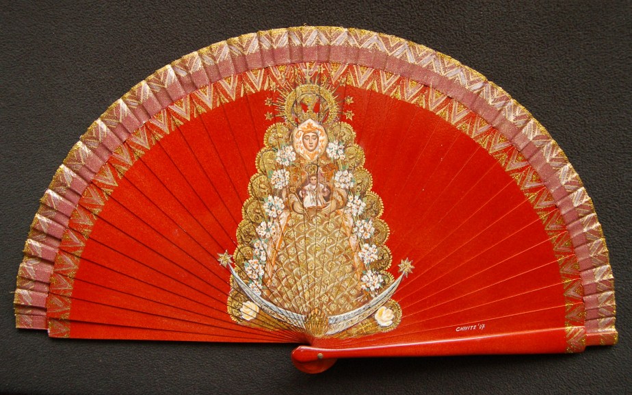Abanico pintado a mano con la imagen de La Virgen del Rocío.